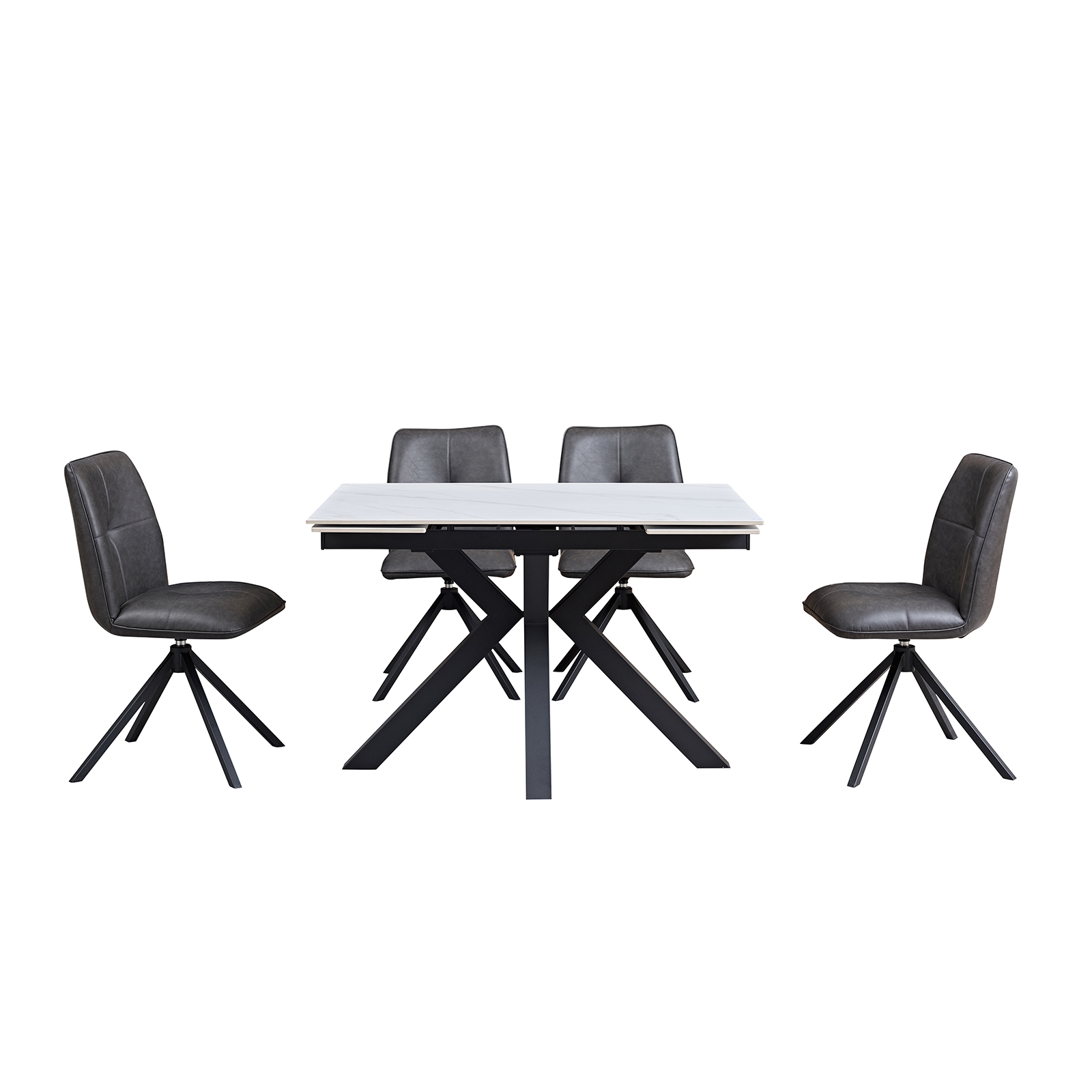 Rialto Small Extending Dining Table – White Sintered Stone + Rialto Vintage Grey Swivel Chairs