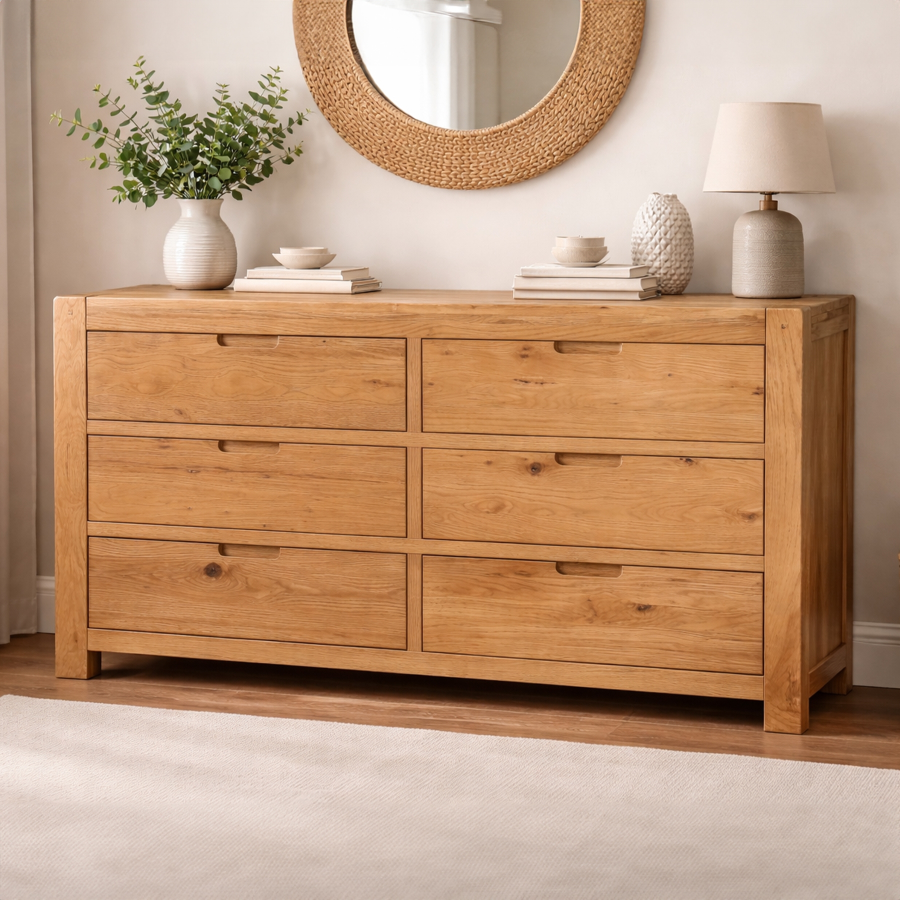 The Loxley Rustic Oak 6 Drawer/3 by 3 Chest of Drawers is part of our specially made Loxley Rustic Oak range built with thick oak timbers that feature naturally occurring rustic knots crafted into modern on-trend furniture. Loxley, although a traditional oak range has an on-trend sleek handleless design making it a popular and stylish option for any home. This oak furniture design has clean lines that will look great in any setting from a newer modern home to a traditional period property or cottage.