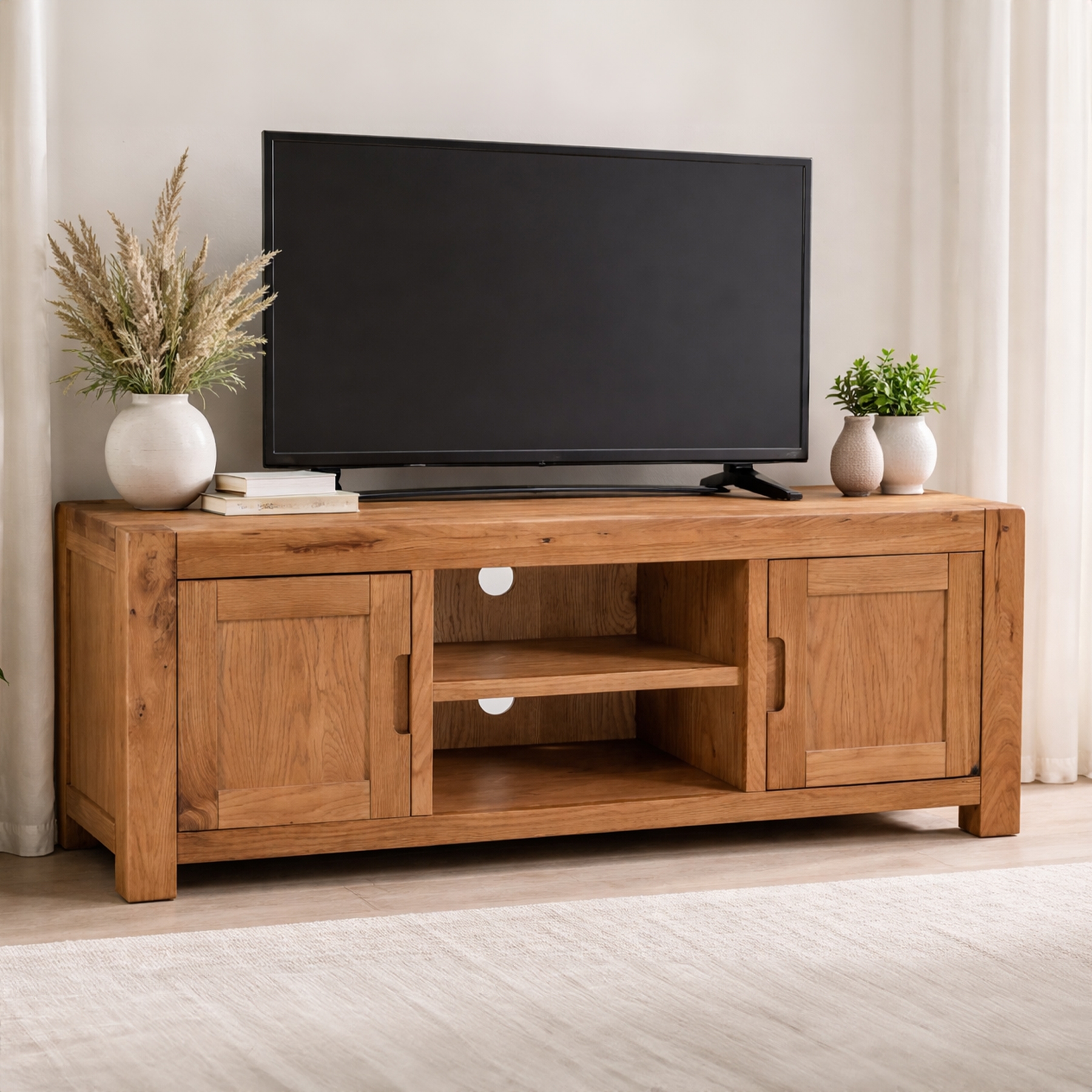 There are two useful storage cupboards which have strong shelves that will not bow or bend over time even if you store heavy items such as books in them. The centre back of the unit has handy cutouts to feed cables through for your TV-related devices such as a digital box or games console. The shelves are solid oak and will not bend or buckle. This furniture is built to last and will not go out of style.