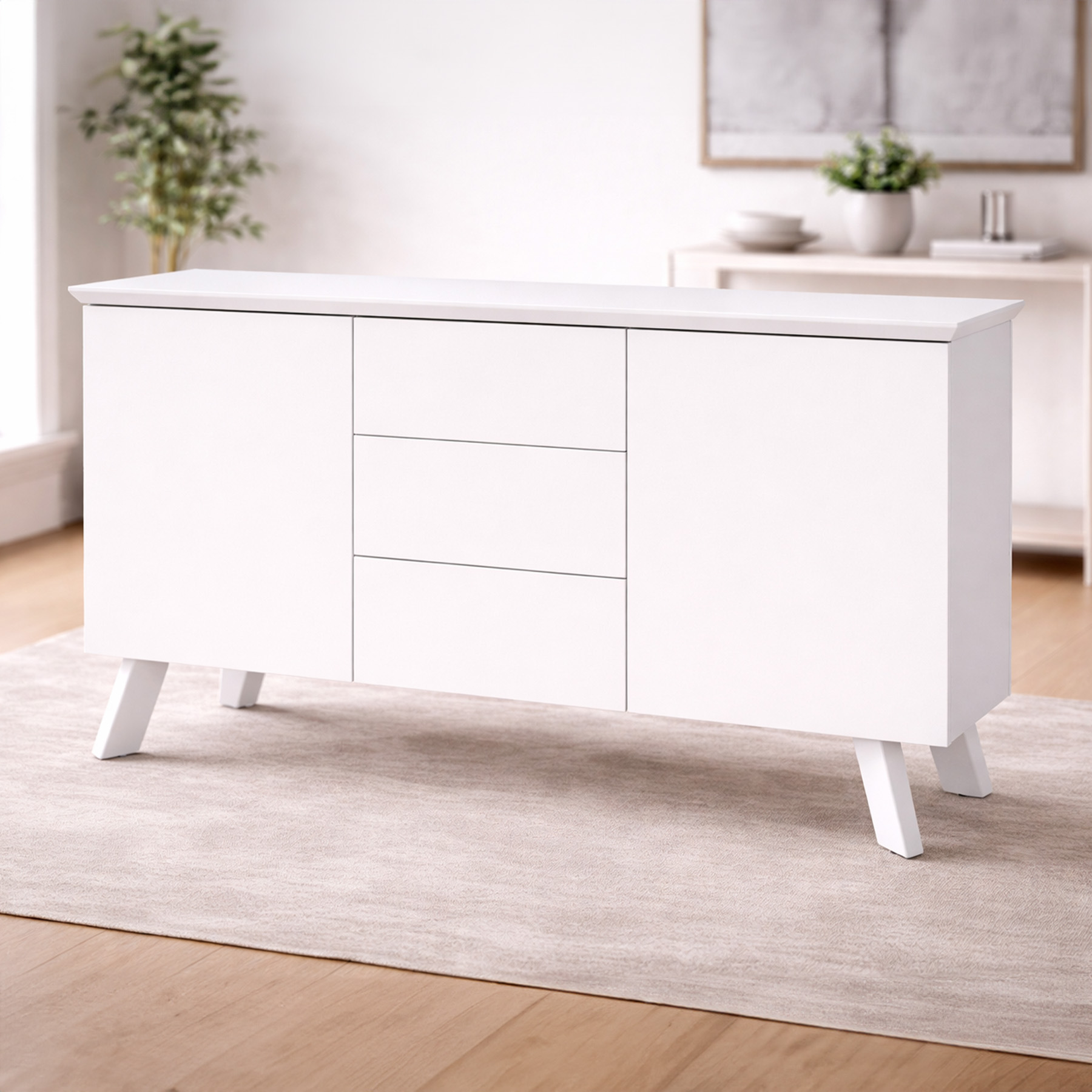 Built with generous storage in mind, the sideboard features three soft-close drawers and two double cupboards with internal shelves – ideal for storing everything from dinnerware and glassware to books, games, or everyday essentials. The glossy surface reflects natural light to brighten your space and create an open, airy atmosphere. ✨