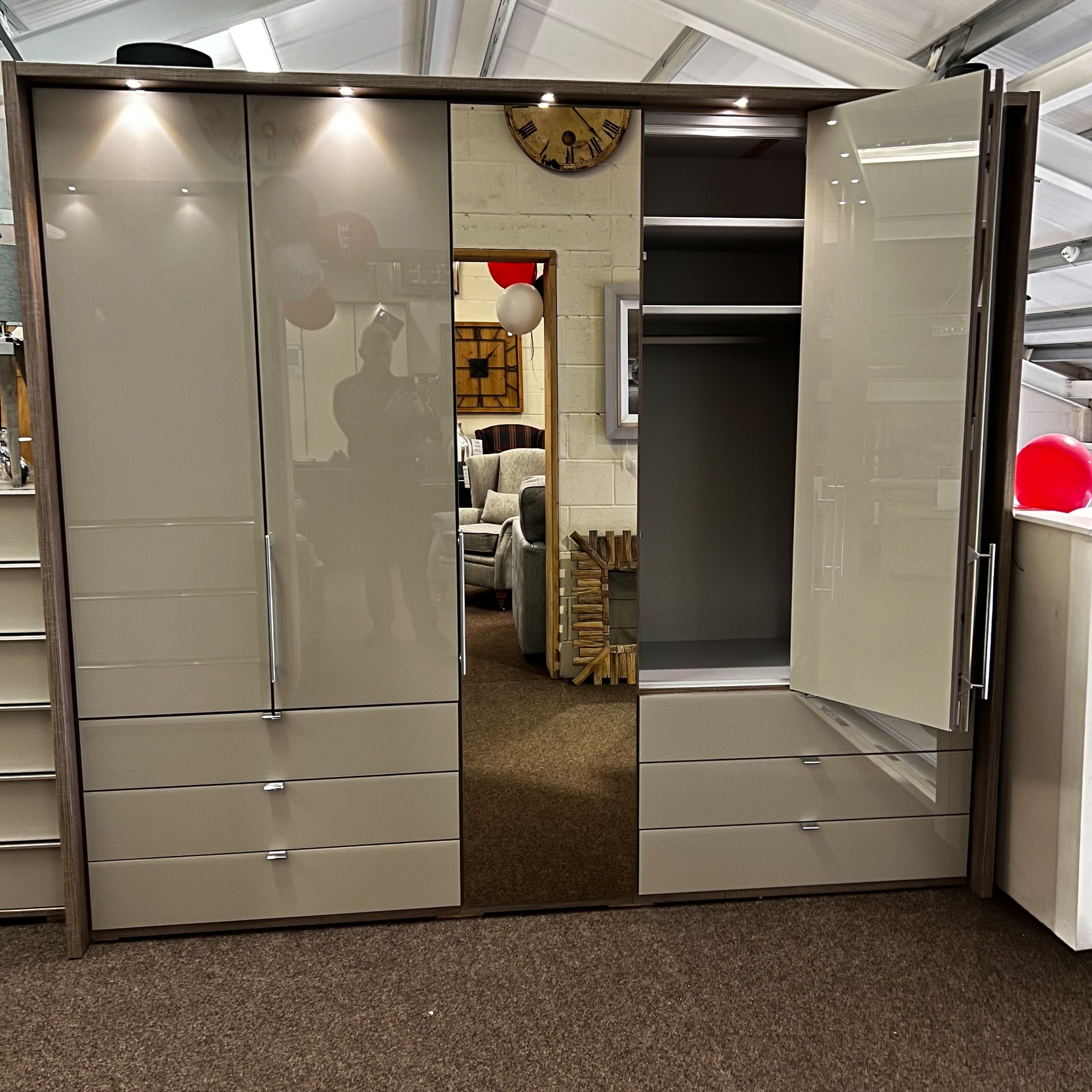 This item is part of our Semi-Fitted Wardrobe selection and is one that we have on display in our showroom. It features 1 full length Mirror door and 2 Sets of bi-fold doors in Pebble Grey glass with Drawers beneath. Passe-partout in Rustic Oak with built in LED lights with an A++ energy rating (Available without passe-partout and lights mechanism at a lower cost). These are fully assembled in your room of choice by one of our trained professionals.