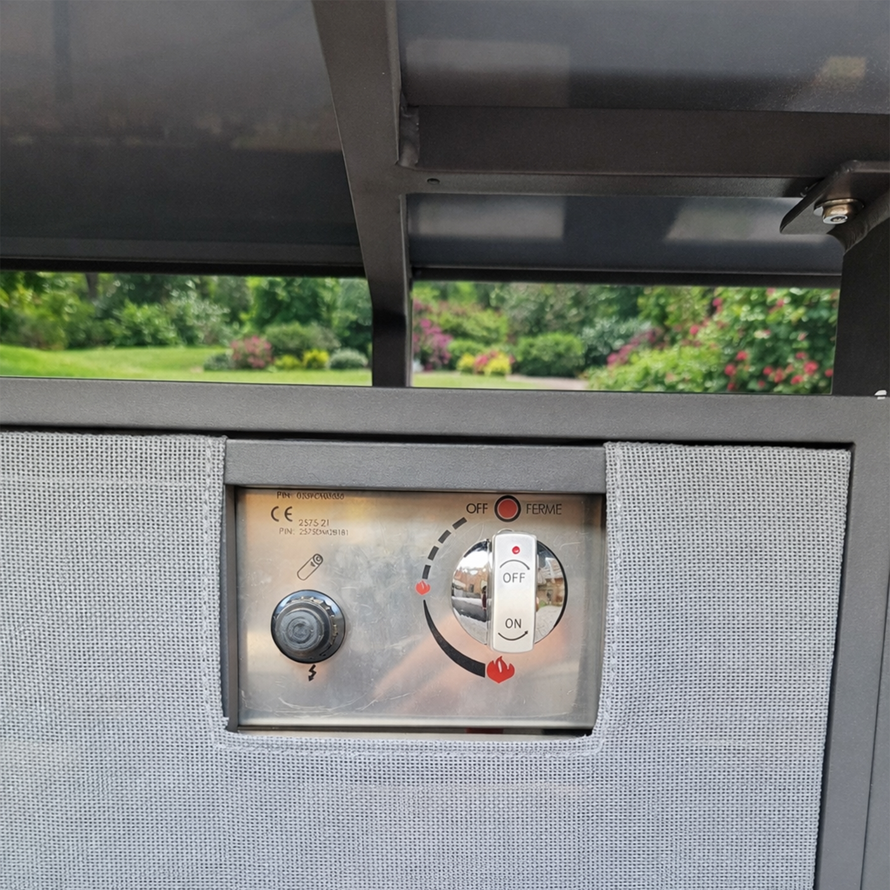The centrepiece rectangular fire pit table boasts a stylish glass top, wind guard, and hidden gas storage. With an adjustable flame and included lid, it effortlessly transitions from a glowing heat source to a full dining surface, giving you flexibility for every occasion.