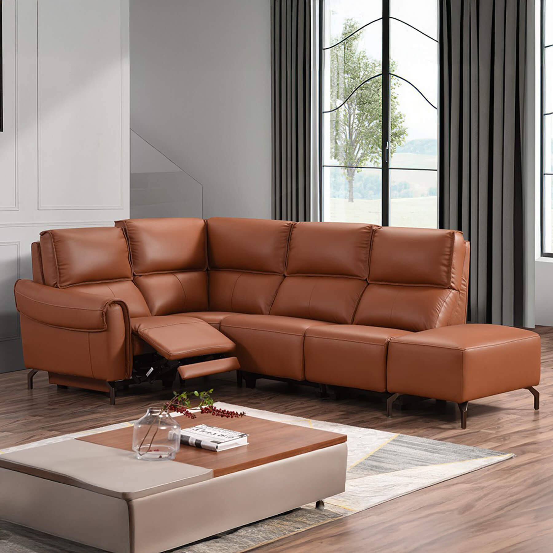 Euston 1 + Corner + 3 with Wireless Charger Console – Tan Genuine Italian Leather Sofa (Electric Reclining)
