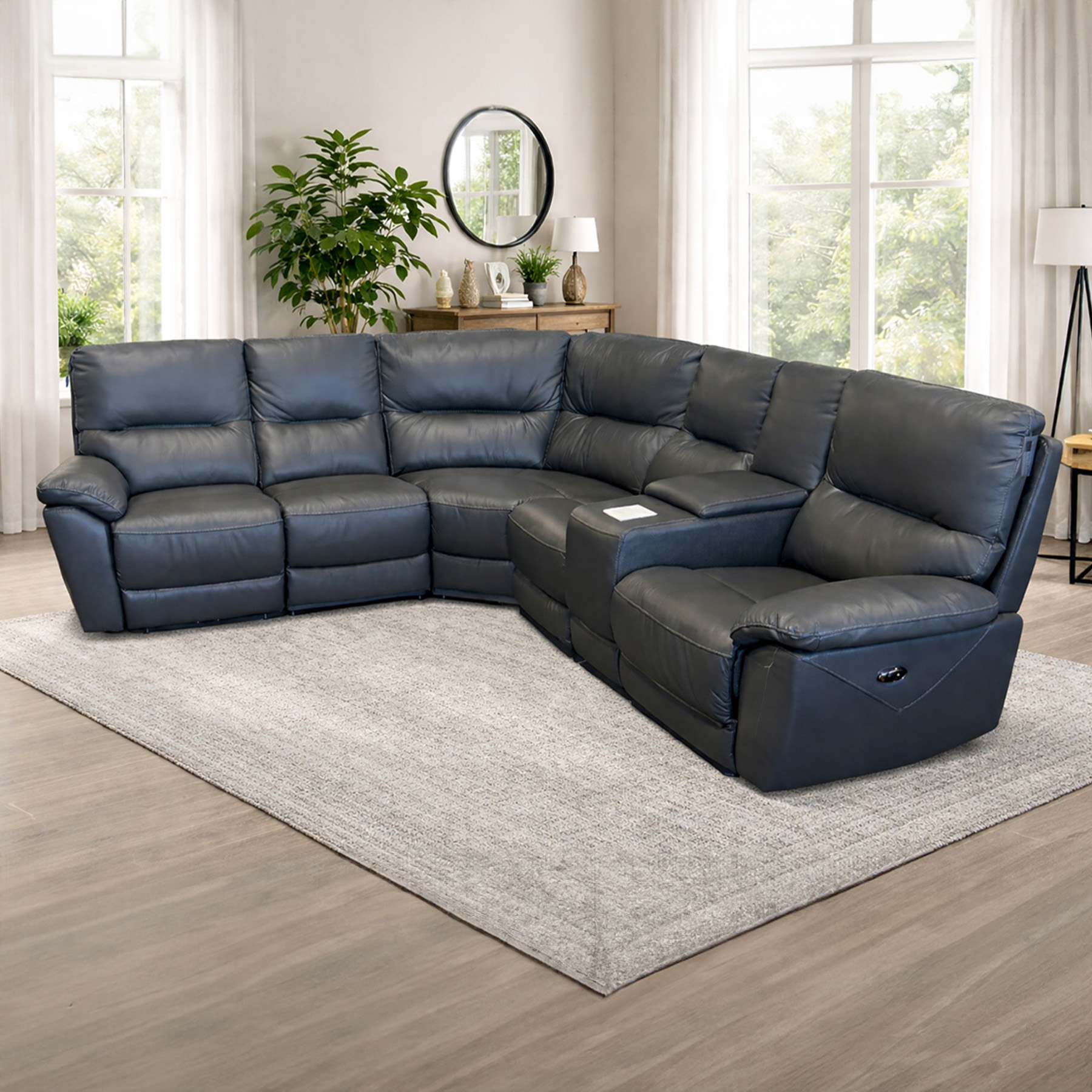 Built for both relaxation and convenience, the Wilson Corner Set features fully electric reclining mechanisms, allowing you to unwind at the touch of a button. The integrated console with storage and music player adds a premium touch, giving you the perfect place to keep essentials close by while enjoying your favourite music in comfort. The rich graphite leather gives this set a sleek, sophisticated look that works beautifully with a wide range of interiors.